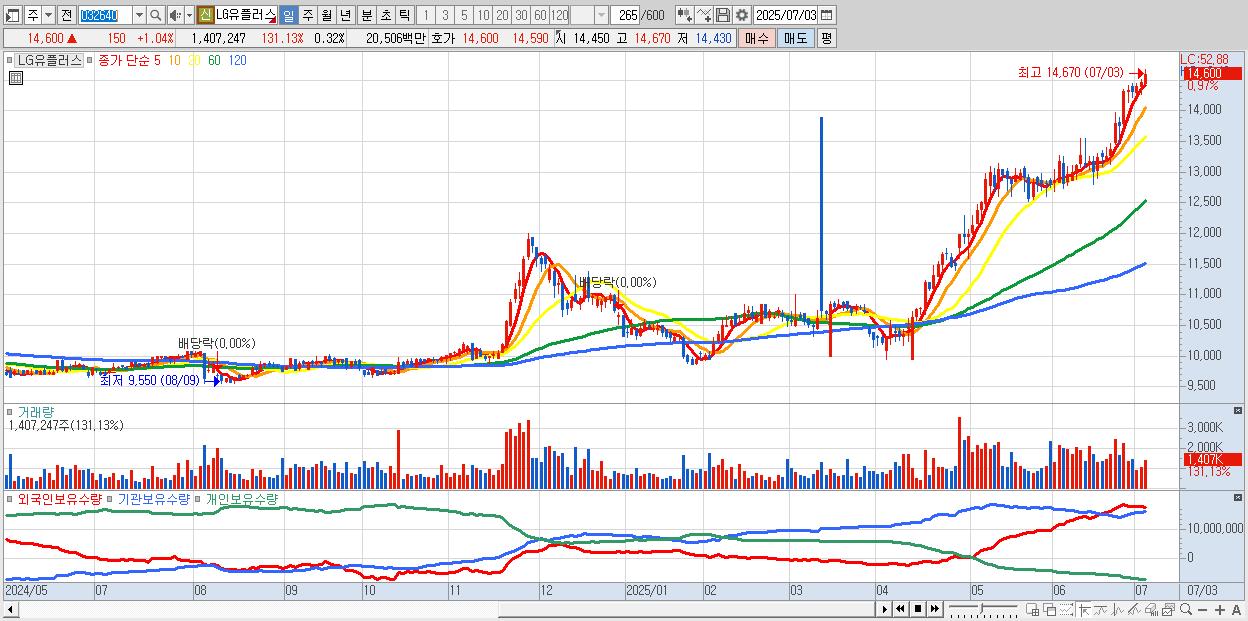- LG유플러스 (14,600원 ▲ 1.04% , 시총: 63,745억, 거래량: 1,302,336, 거래대금:190억, KOSPI)