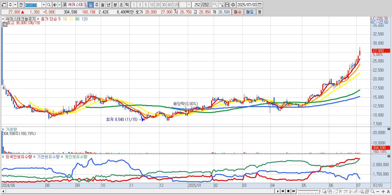 - 씨어스테크놀로지 (27,900원 ▲ 5.08% , 시총: 3,513억, 거래량: 304,598, 거래대금:85억, KOSDAQ)