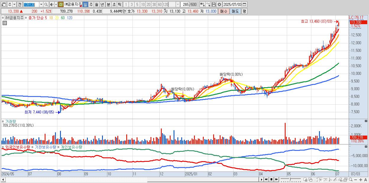 - iM금융지주 (13,300원 ▲ 1.29% , 시총: 22,130억, 거래량: 606,784, 거래대금:81억, KOSPI)
