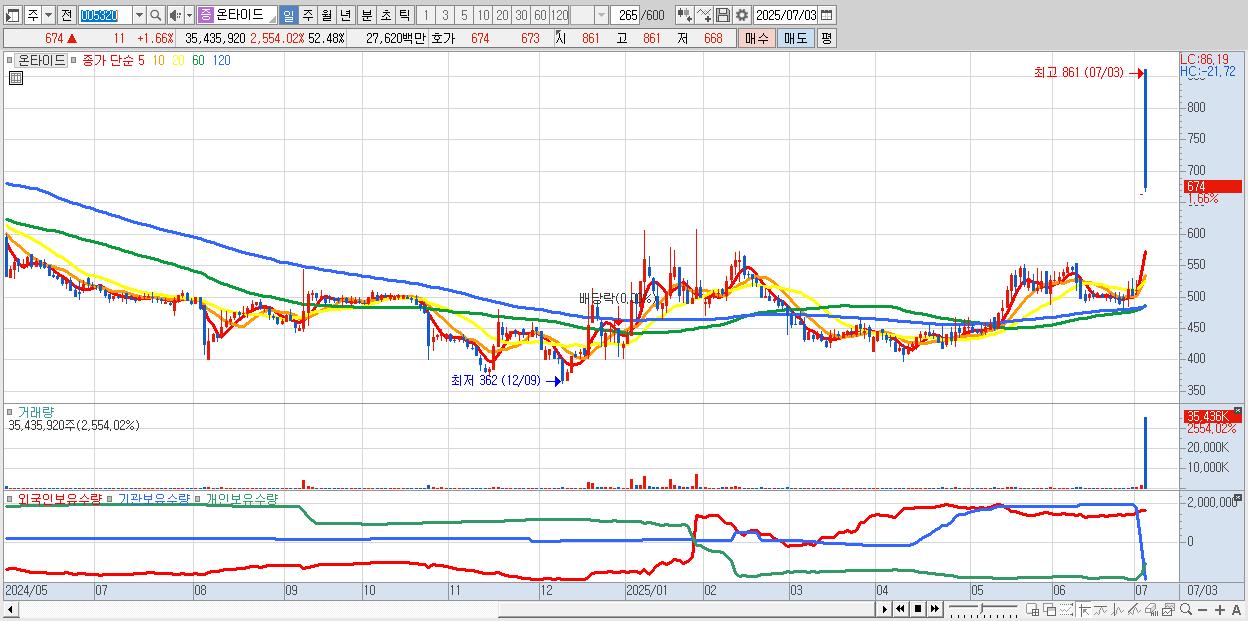 - 온타이드 (674원 ▲ 1.66% , 시총: 455억, 거래량: 35,435,920, 거래대금:276억, KOSPI)