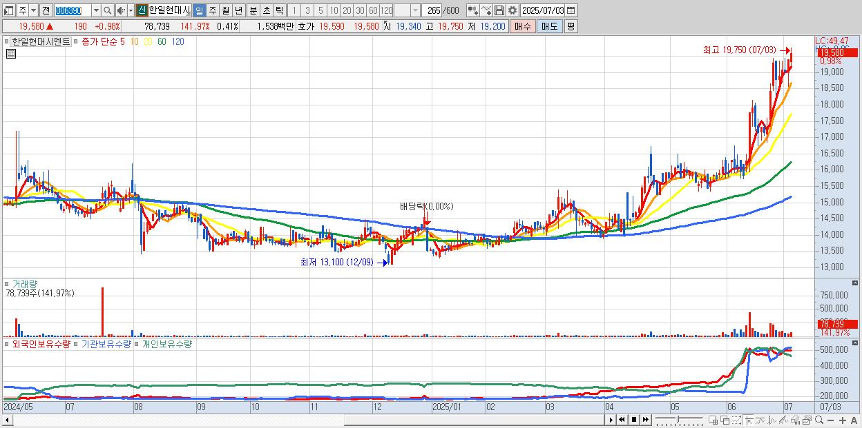 - 한일현대시멘트 (19,580원 ▲ 0.98% , 시총: 3,784억, 거래량: 78,739, 거래대금:15억, KOSPI)