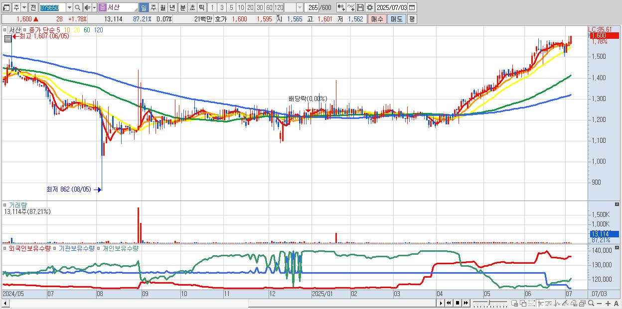 - 서산 (1,600원 ▲ 1.78% , 시총: 320억, 거래량: 13,114, 거래대금:0억, KOSDAQ)