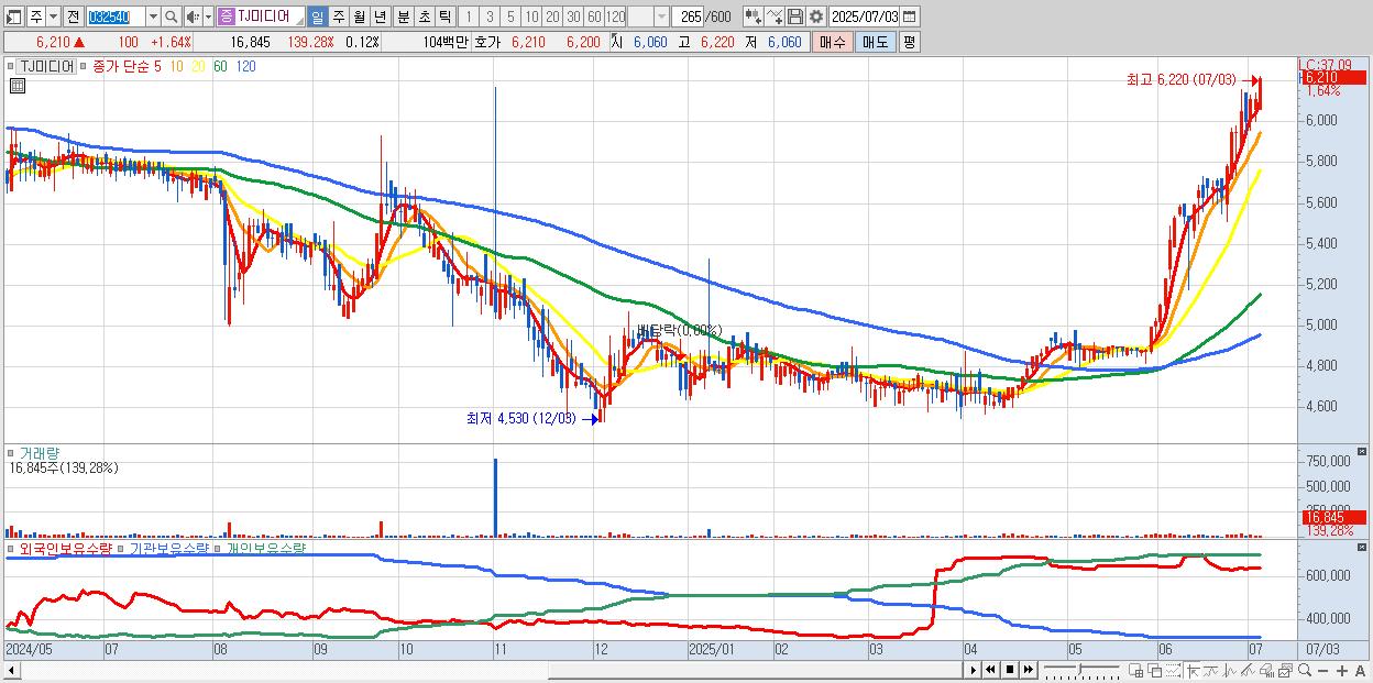 - TJ미디어 (6,210원 ▲ 1.64% , 시총: 865억, 거래량: 16,845, 거래대금:1억, KOSDAQ)