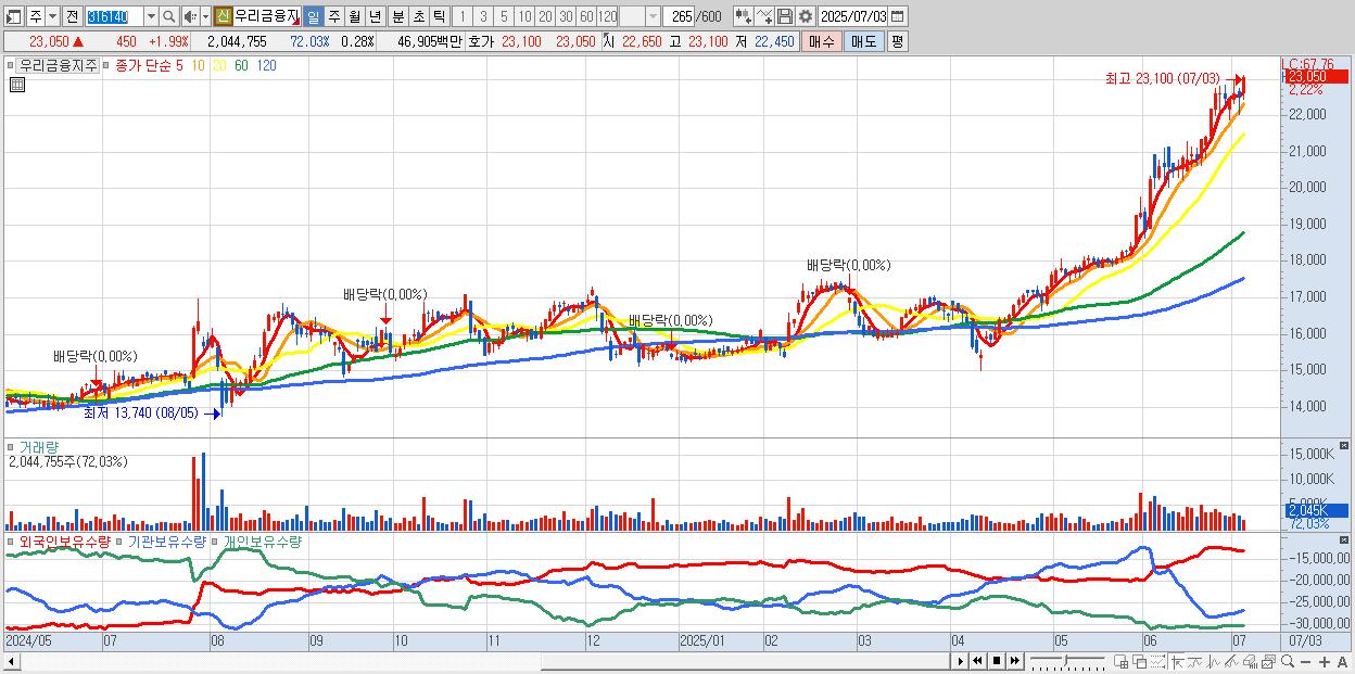 - 우리금융지주 (23,050원 ▲ 1.99% , 시총: 171,167억, 거래량: 1,489,222, 거래대금:342억, KOSPI)