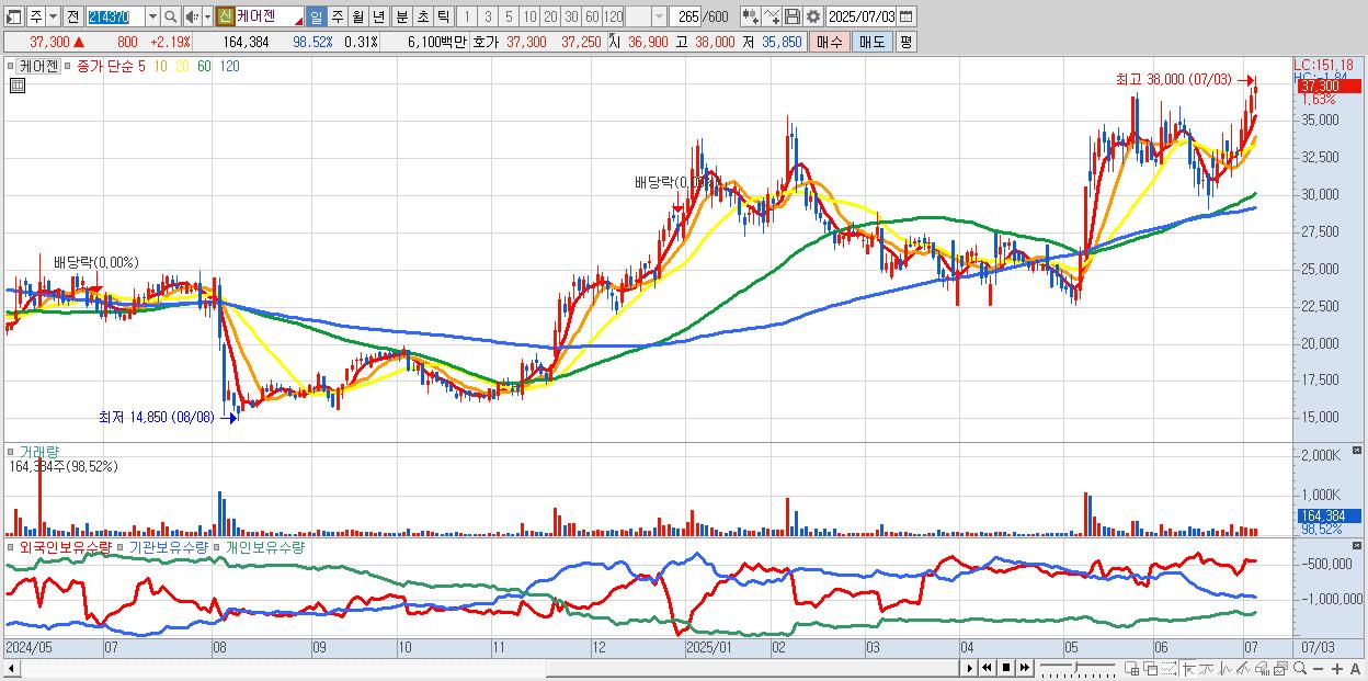 - 케어젠 (37,250원 ▲ 2.05% , 시총: 20,009억, 거래량: 102,023, 거래대금:38억, KOSDAQ)
