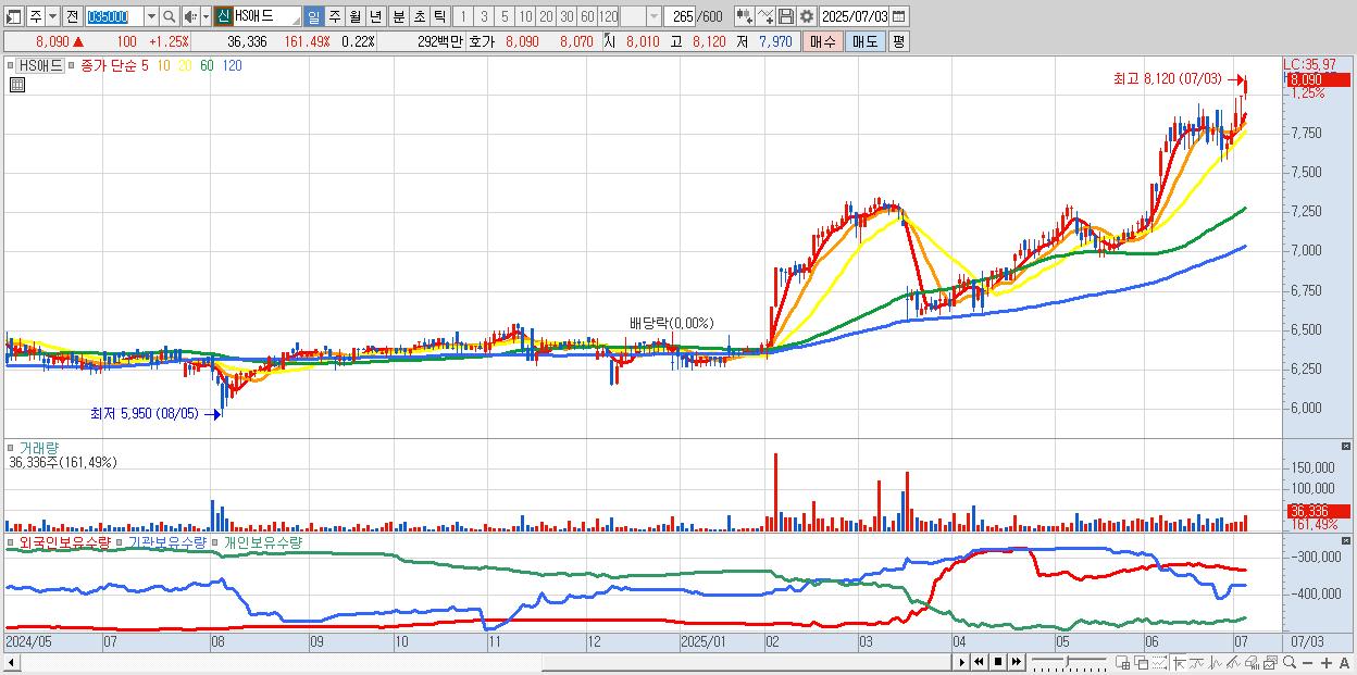 - HS애드 (8,090원 ▲ 1.25% , 시총: 1,340억, 거래량: 36,336, 거래대금:3억, KOSPI)