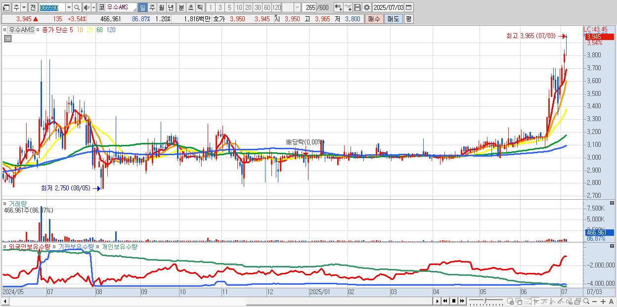 - 우수AMS (3,945원 ▲ 3.54% , 시총: 1,541억, 거래량: 466,961, 거래대금:18억, KOSDAQ)
