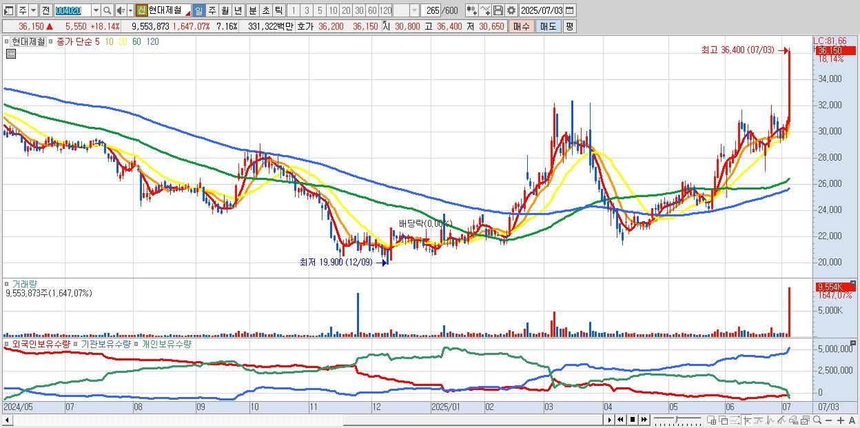 - 현대제철 (35,550원 ▲ 16.18% , 시총: 47,440억, 거래량: 5,347,993, 거래대금:1,843억, KOSPI)