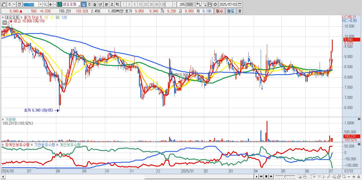 - 네오오토 (9,840원 ▲ 6.03% , 시총: 775억, 거래량: 193,231, 거래대금:19억, KOSDAQ)
