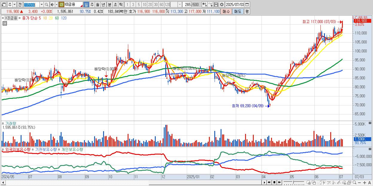 - KB금융 (116,900원 ▲ 3% , 시총: 445,929억, 거래량: 1,495,856, 거래대금:1,724억, KOSPI)