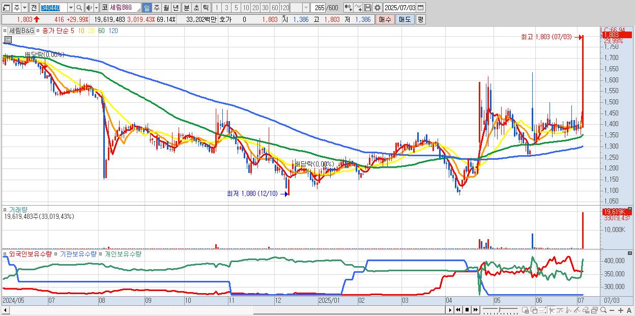 세림B&G 1,803원 ▲ 29.99% (KOSDAQ, 340440)