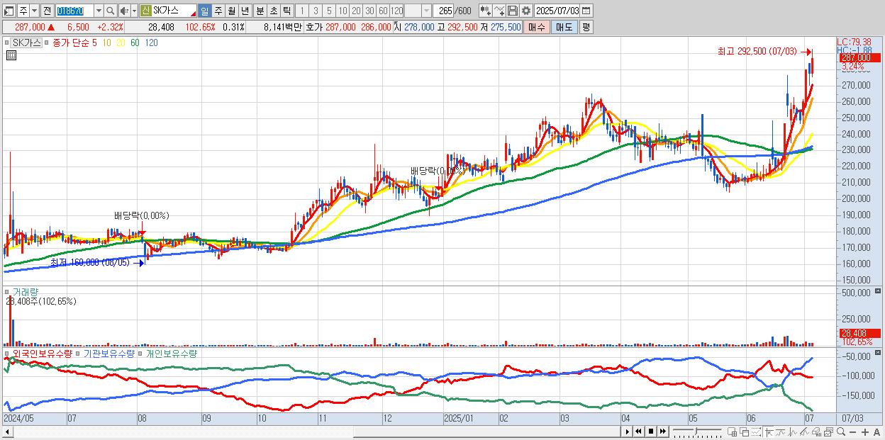 - SK가스 (285,000원 ▲ 1.6% , 시총: 26,349억, 거래량: 24,220, 거래대금:69억, KOSPI)