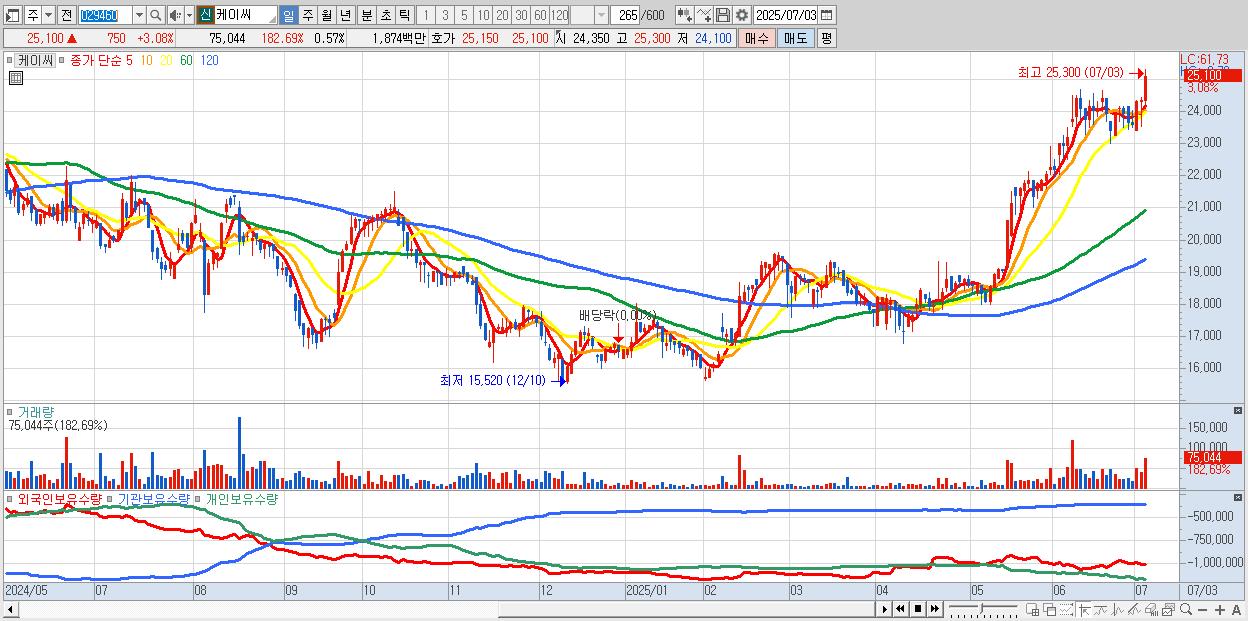 - 케이씨 (25,100원 ▲ 3.08% , 시총: 3,321억, 거래량: 75,044, 거래대금:19억, KOSPI)