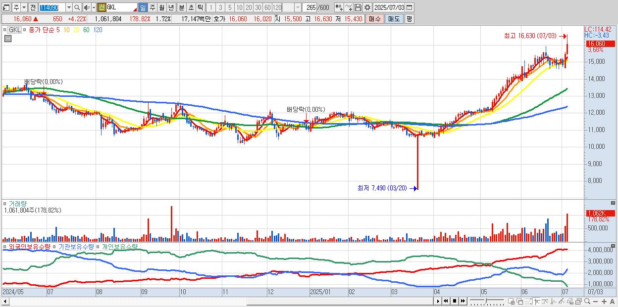 - GKL (16,180원 ▲ 5% , 시총: 10,008억, 거래량: 822,835, 거래대금:133억, KOSPI)