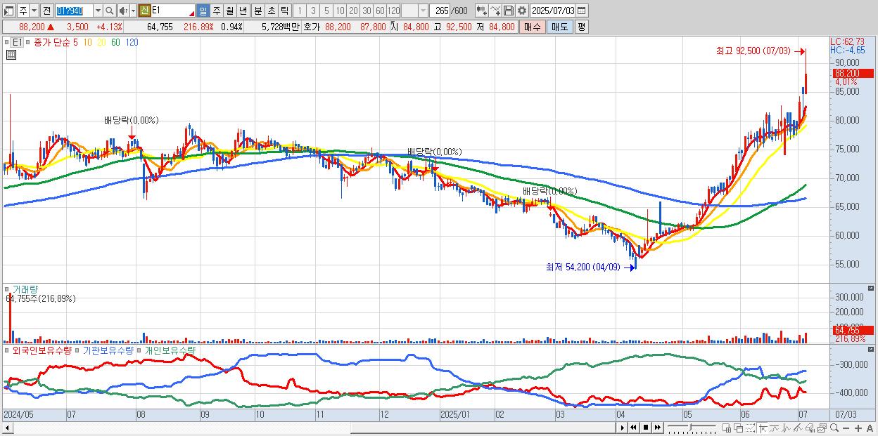 - E1 (88,000원 ▲ 3.9% , 시총: 6,037억, 거래량: 50,207, 거래대금:44억, KOSPI)