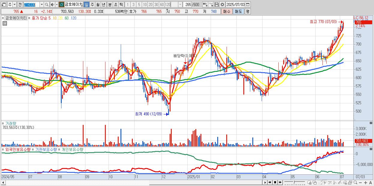 - 금호에이치티 (765원 ▲ 2.14% , 시총: 1,636억, 거래량: 703,563, 거래대금:5억, KOSPI)