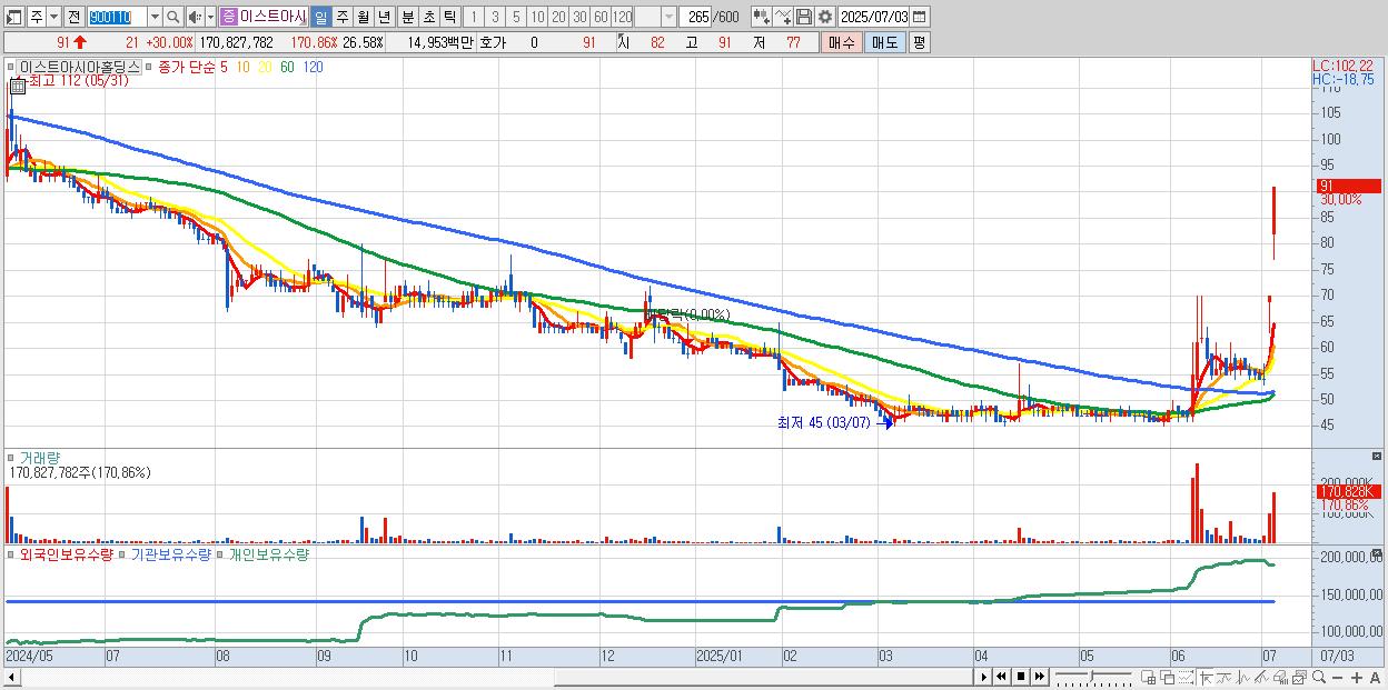 이스트아시아홀딩스 91원 ▲ 30% (KOSDAQ, 900110)