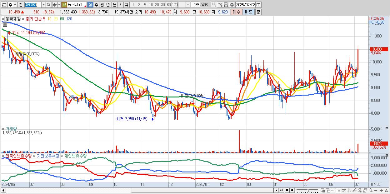 - 동국제강 (10,450원 ▲ 7.95% , 시총: 5,184억, 거래량: 1,391,962, 거래대금:143억, KOSPI)