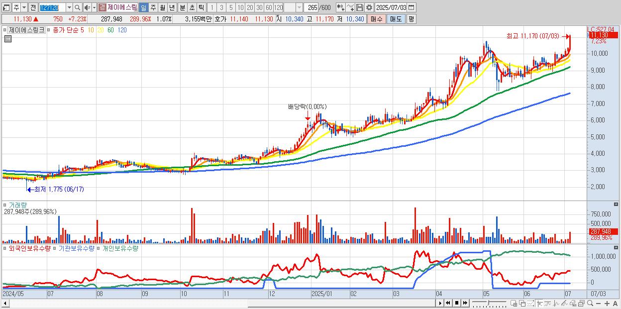 - 제이에스링크 (11,130원 ▲ 7.23% , 시총: 3,003억, 거래량: 287,948, 거래대금:32억, KOSDAQ)