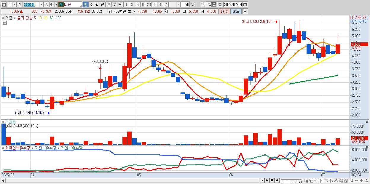 - 더즌 (4,685원 ▲ 8.32% , 시총: 3,358억, 거래량: 25,661,044, 거래대금:1,214억)