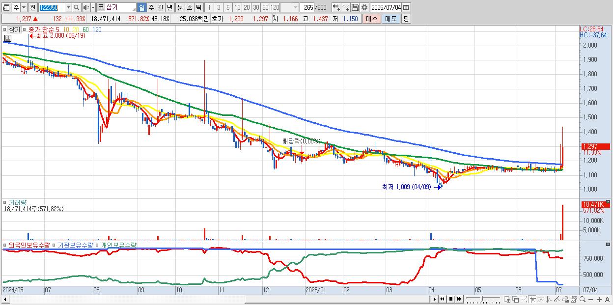 - 삼기 (1,297원 ▲ 11.33% , 시총: 497억, 거래량: 18,471,414, 거래대금:250억)
