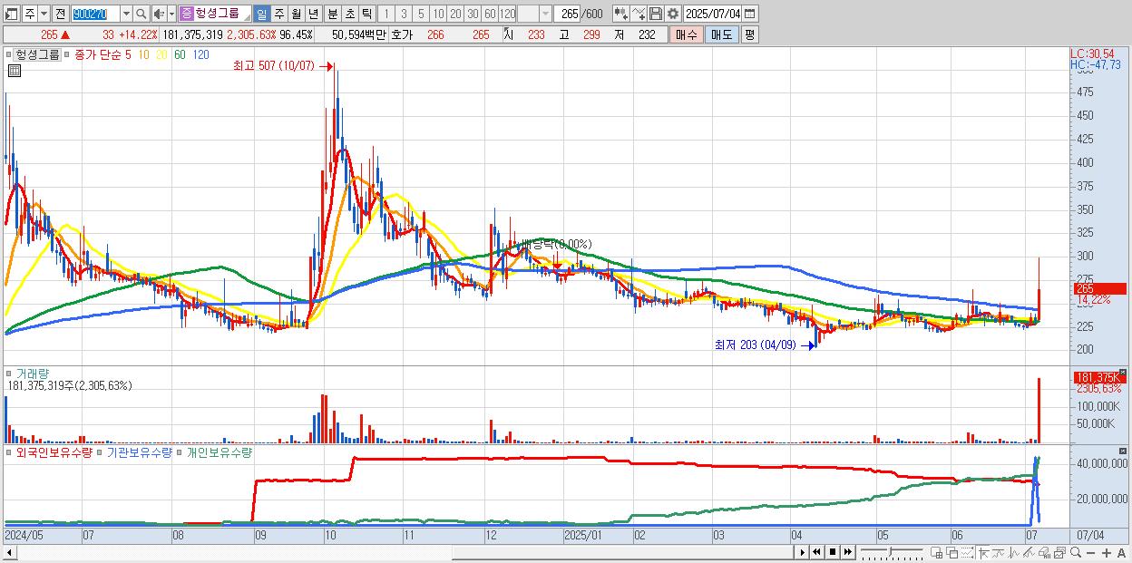 - 헝셩그룹 (265원 ▲ 14.22% , 시총: 498억, 거래량: 181,375,319, 거래대금:506억)