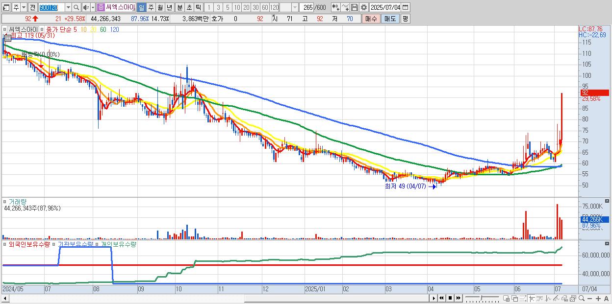 - 씨엑스아이 (92원 ▲ 29.58% , 시총: 277억, 거래량: 44,266,343, 거래대금:39억)