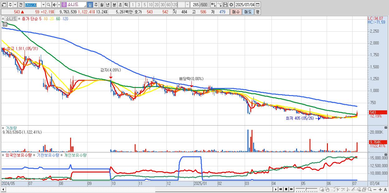 - 소니드 (543원 ▲ 12.19% , 시총: 401억, 거래량: 9,763,539, 거래대금:53억)