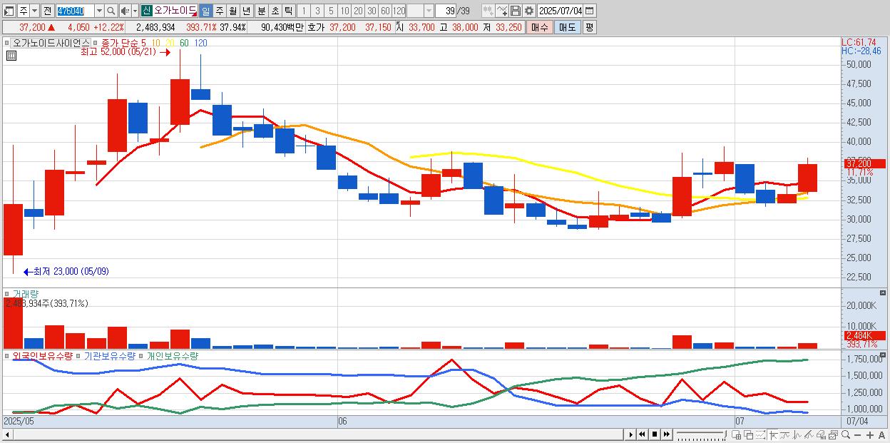 - 오가노이드사이언스 (36,600원 ▲ 10.41% , 시총: 2,396억, 거래량: 1,258,307, 거래대금:458억)