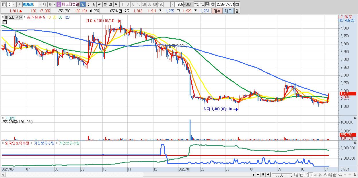 - 베노티앤알 (1,911원 ▲ 7.06% , 시총: 717억, 거래량: 355,780, 거래대금:7억)