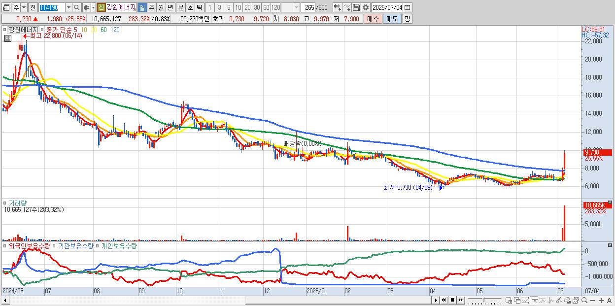 - 강원에너지 (9,730원 ▲ 25.55% , 시총: 2,542억, 거래량: 10,665,127, 거래대금:993억)