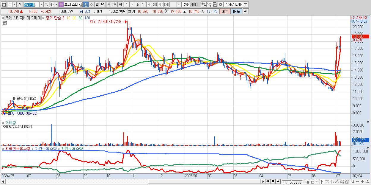 - 프레스티지바이오파마 (18,670원 ▲ 8.42% , 시총: 11,220억, 거래량: 580,577, 거래대금:105억)