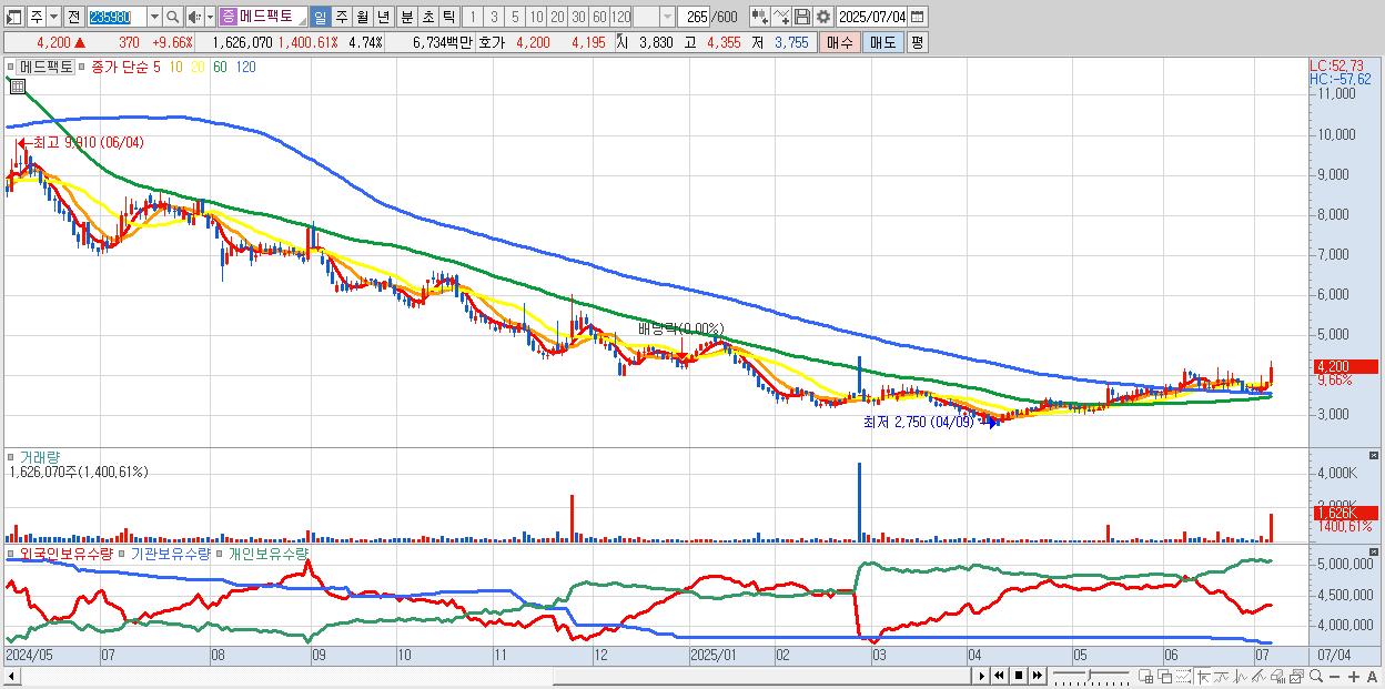 - 메드팩토 (4,200원 ▲ 9.66% , 시총: 1,440억, 거래량: 1,626,070, 거래대금:67억)