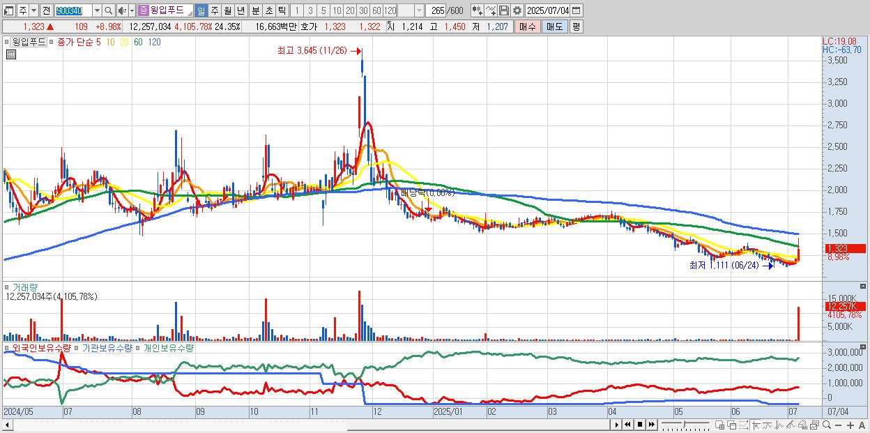 - 윙입푸드 (1,323원 ▲ 8.98% , 시총: 666억, 거래량: 12,257,034, 거래대금:167억)