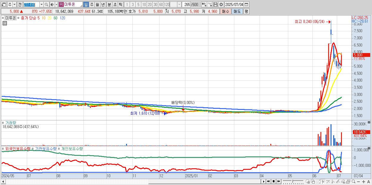 - 미투온 (5,800원 ▲ 17.65% , 시총: 1,763억, 거래량: 18,642,069, 거래대금:1,052억)