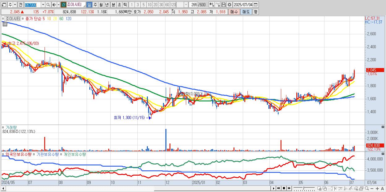 - 조이시티 (2,045원 ▲ 7.07% , 시총: 1,430억, 거래량: 824,838, 거래대금:17억)