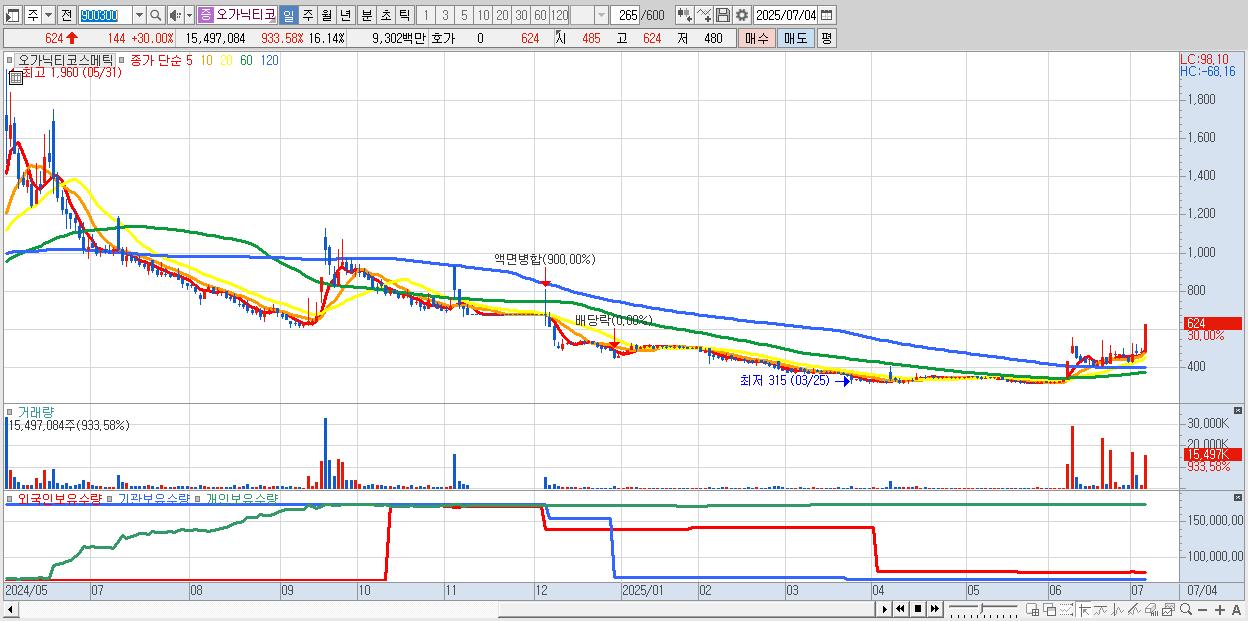 - 오가닉티코스메틱 (624원 ▲ 30% , 시총: 599억, 거래량: 15,497,084, 거래대금:93억)