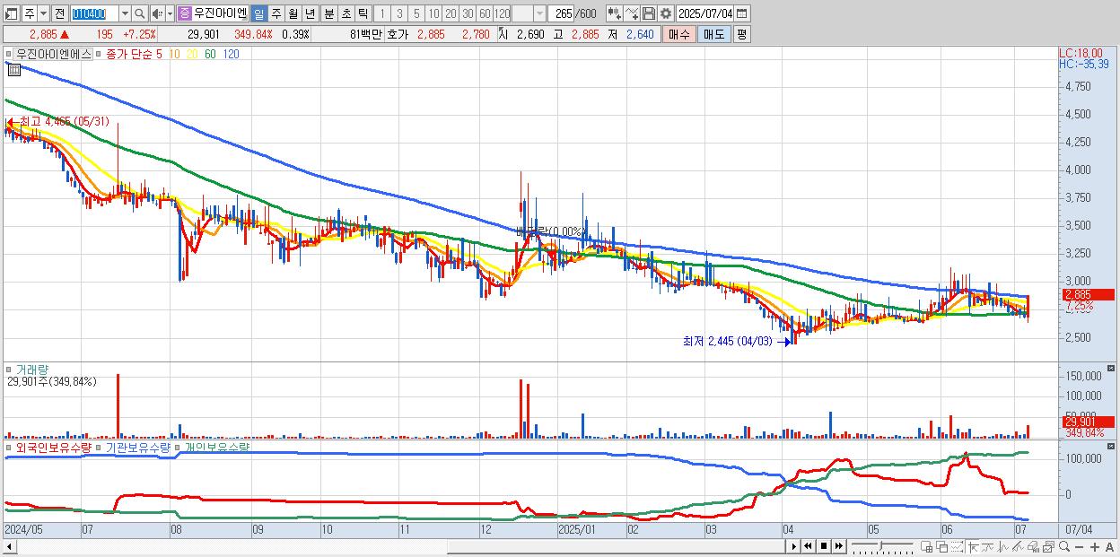 - 우진아이엔에스 (2,885원 ▲ 7.25% , 시총: 220억, 거래량: 29,901, 거래대금:1억)