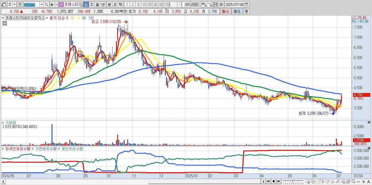 - 프레스티지바이오로직스 (4,150원 ▲ 8.78% , 시총: 3,227억, 거래량: 1,073,907, 거래대금:44억)