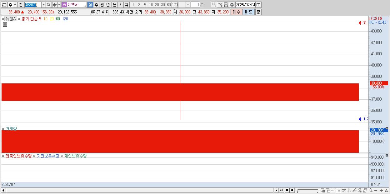 - 뉴엔AI (38,400원 ▲ 156% , 시총: 3,410억, 거래량: 20,192,555, 거래대금:8,084억)