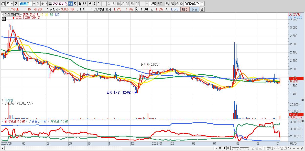 - 아이즈비전 (1,776원 ▲ 6.92% , 시총: 468억, 거래량: 4,244,757, 거래대금:75억)