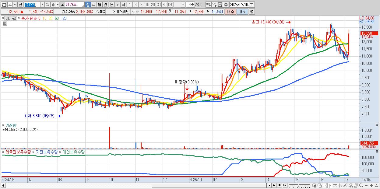 - 메카로 (12,590원 ▲ 13.94% , 시총: 1,283억, 거래량: 244,355, 거래대금:30억)
