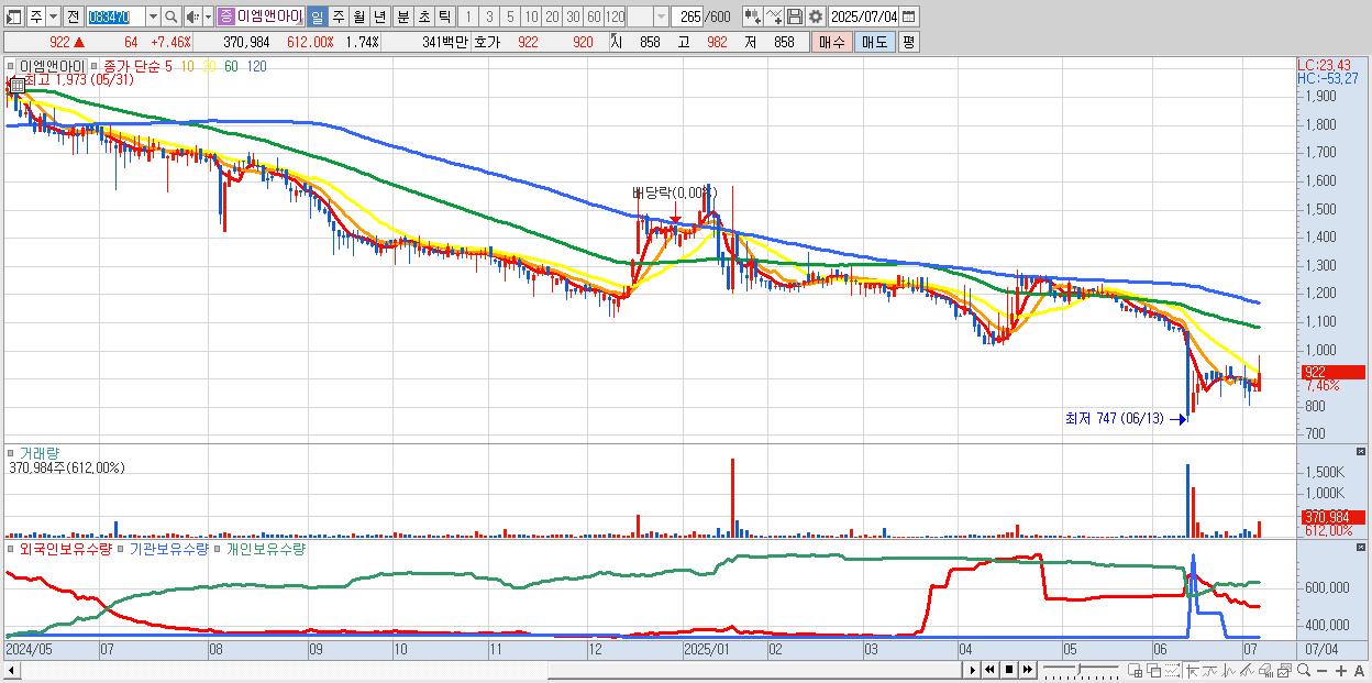 - 이엠앤아이 (922원 ▲ 7.46% , 시총: 197억, 거래량: 370,984, 거래대금:3억)