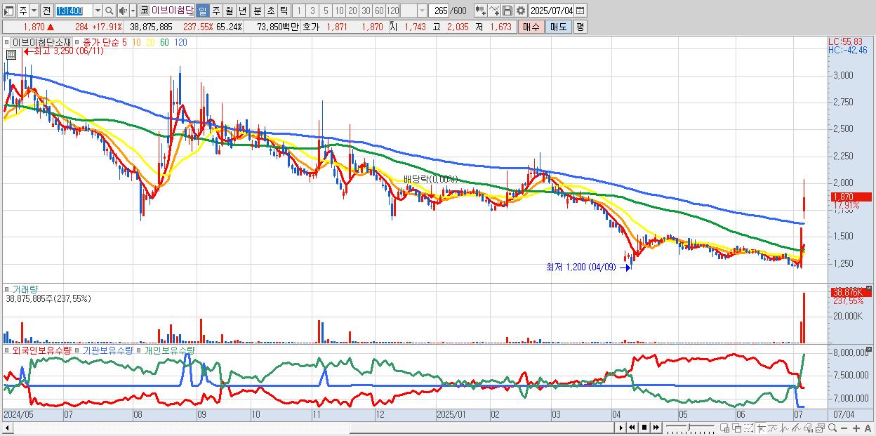 - 이브이첨단소재 (1,870원 ▲ 17.91% , 시총: 1,114억, 거래량: 38,875,885, 거래대금:739억)