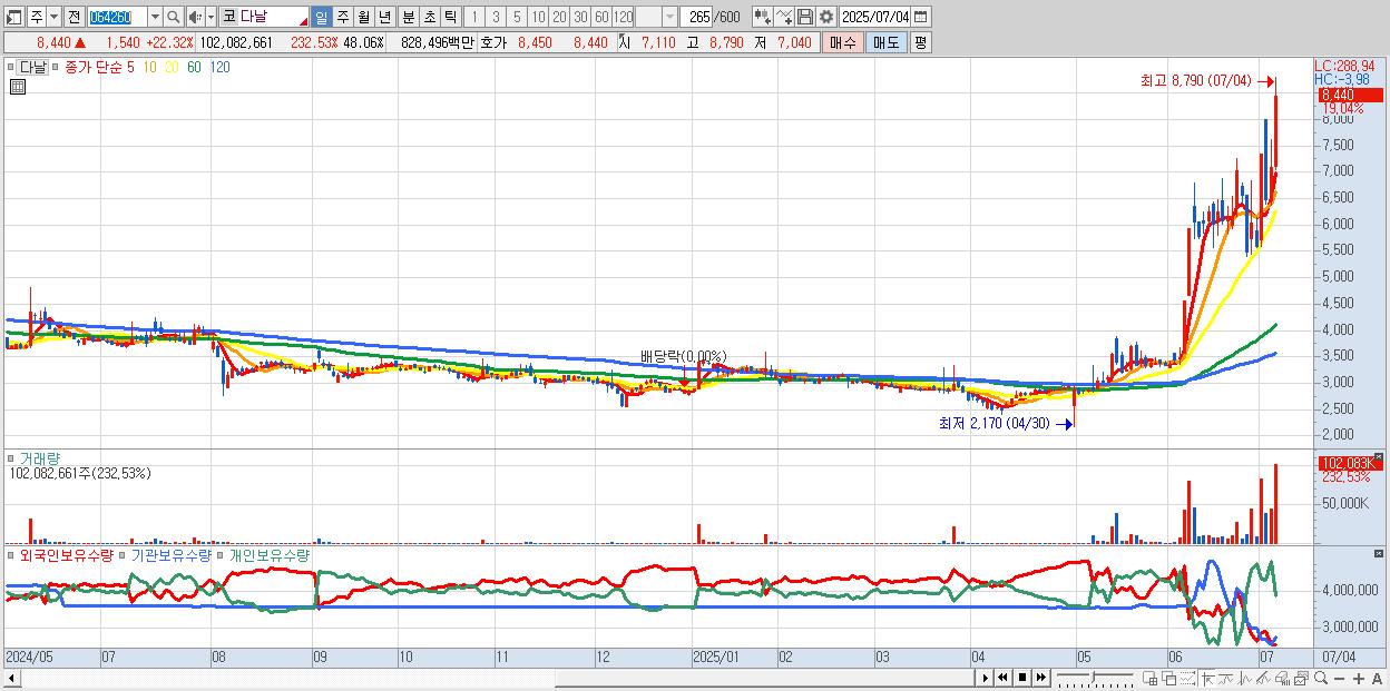- 다날 (8,470원 ▲ 22.75% , 시총: 5,840억, 거래량: 50,641,636, 거래대금:4,125억)