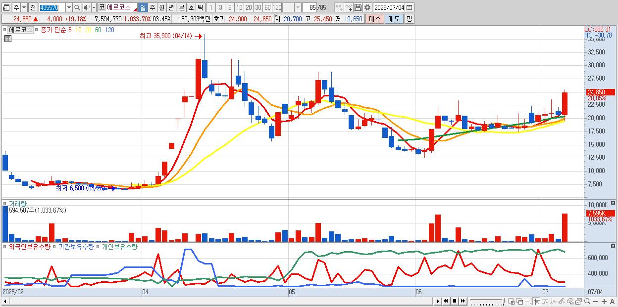 - 에르코스 (25,250원 ▲ 21.1% , 시총: 1,854억, 거래량: 4,042,871, 거래대금:956억)