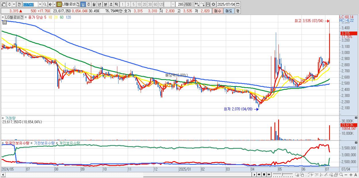 - LG헬로비전 (3,315원 ▲ 17.76% , 시총: 2,567억, 거래량: 23,617,350, 거래대금:768억)