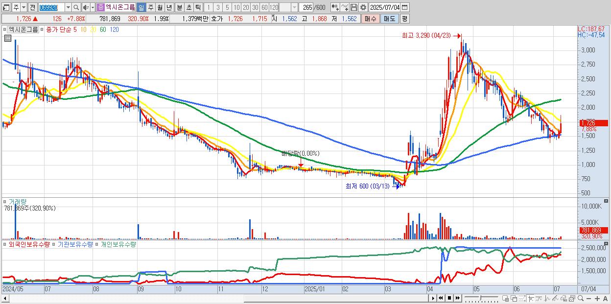 - 엑시온그룹 (1,726원 ▲ 7.88% , 시총: 680억, 거래량: 781,869, 거래대금:14억)