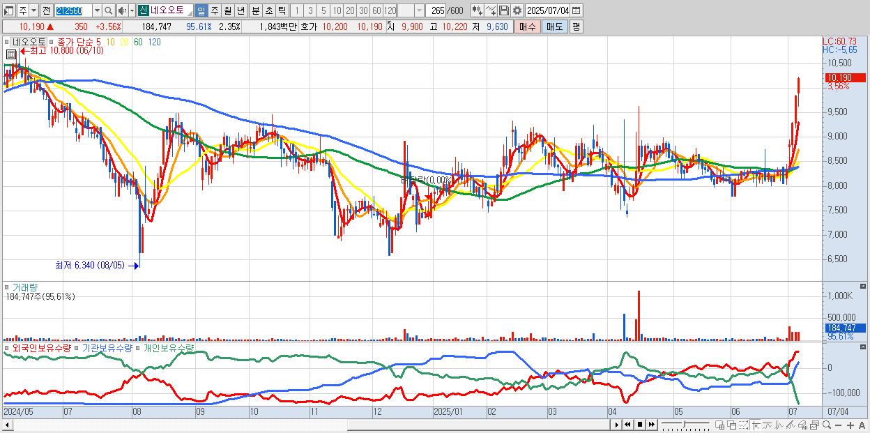 - 네오오토 (10,190원 ▲ 3.56% , 시총: 802억, 거래량: 184,747, 거래대금:18억, KOSDAQ)