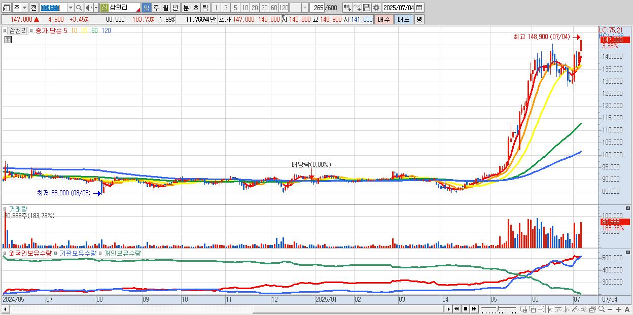 - 삼천리 (147,400원 ▲ 3.73% , 시총: 5,977억, 거래량: 54,759, 거래대금:80억, KOSPI)